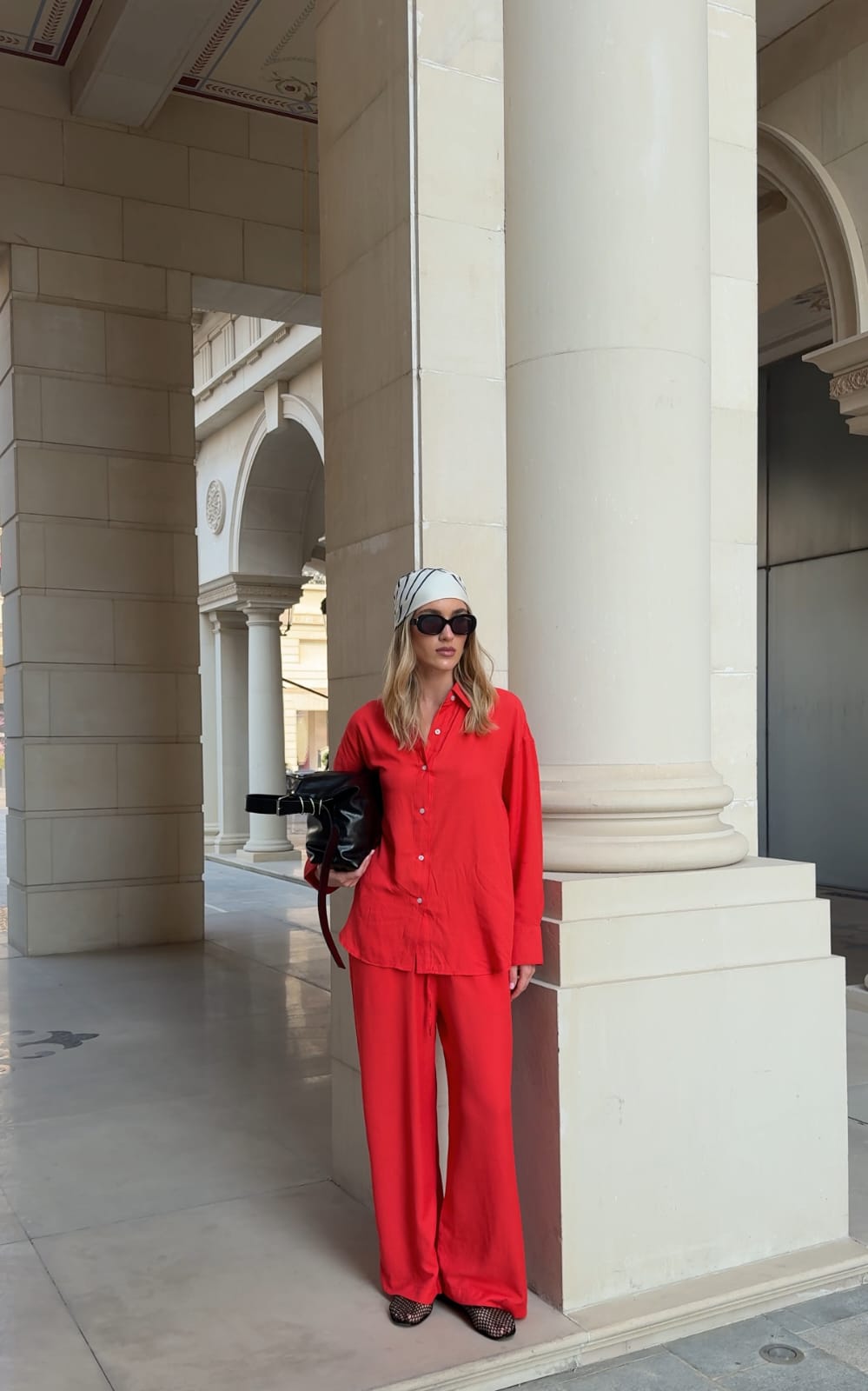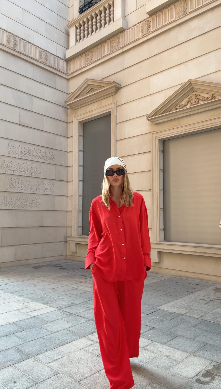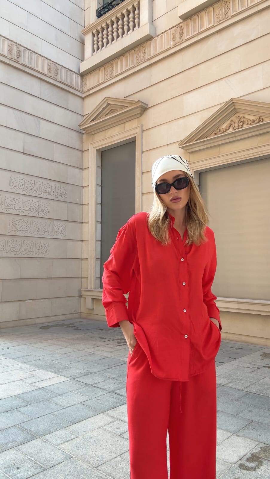 Turn heads in our Scarlet Statement Co-Ord Set — where bold color meets effortless chic. This vibrant red ensemble features an oversized button-up shirt with relaxed sleeves and a clean front placket, paired with high-waisted wide-leg pants that flow with every step. Designed for comfort and confidence, the lightweight fabric drapes beautifully while keeping you cool. Whether you’re strolling through the city or meeting friends for brunch, this set is your go-to for making a stylish impression without trying too hard. Tuck it in for structure, or leave it loose for laid-back luxury. Add sunglasses and a headscarf (like shown!) to complete the look — modern, modest, and undeniably magnetic.